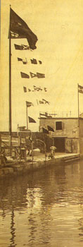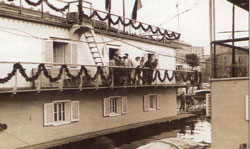 | Il progetto fu elaborato dall'allora presidente ing. Andrea Ghira, che nel frattempo era succeduto a Camillo Picciola acclamato Presidente onorario, ed il 4 settembre 1909 la nuova canottiera galleggiante proveniente dal Cantiere Marco V. Martinolich di Lussino raggiunse la sua sede in Sacchetta al traino di un rimorchiatore della ditta Tripcovich. Terzo presidente fu dal 1912 al 1920 Mario Anninger: era il difficile periodo della prima guerra mondiale. | | Una fiancata della sede galleggiante, la terza In ordine di tempo dal 1909 al 1954 |